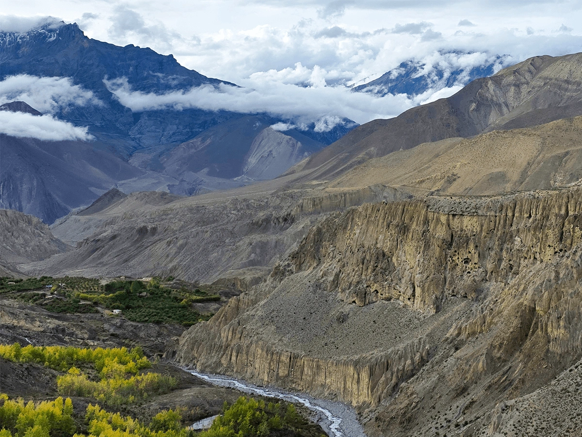 Upper Mustang lies in the trans-Himalayan zone, north of the Annapurna range and close to the Tibetan border. Because the region is sheltered from monsoon rains, its climate is dry and semi-desert in nature. The landscape is characterized by barren hills, colorful rock formations, eroded cliffs, and wide river valleys carved by the Kali Gandaki River.